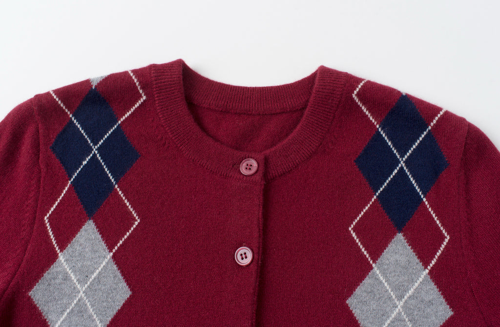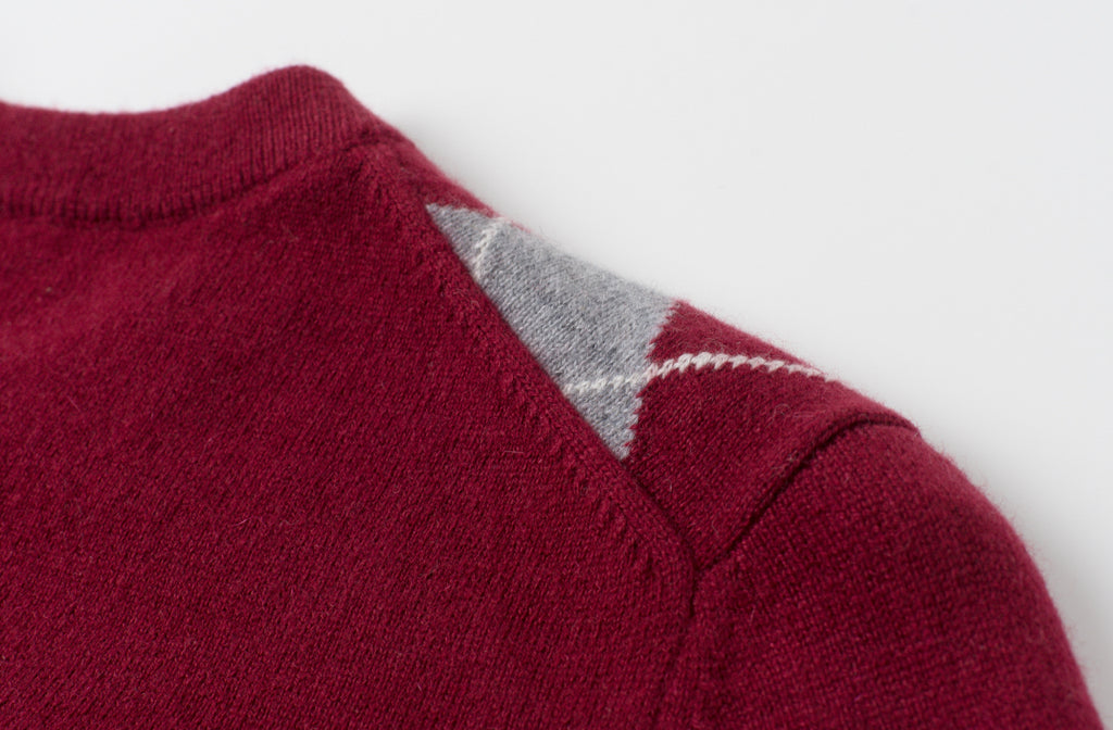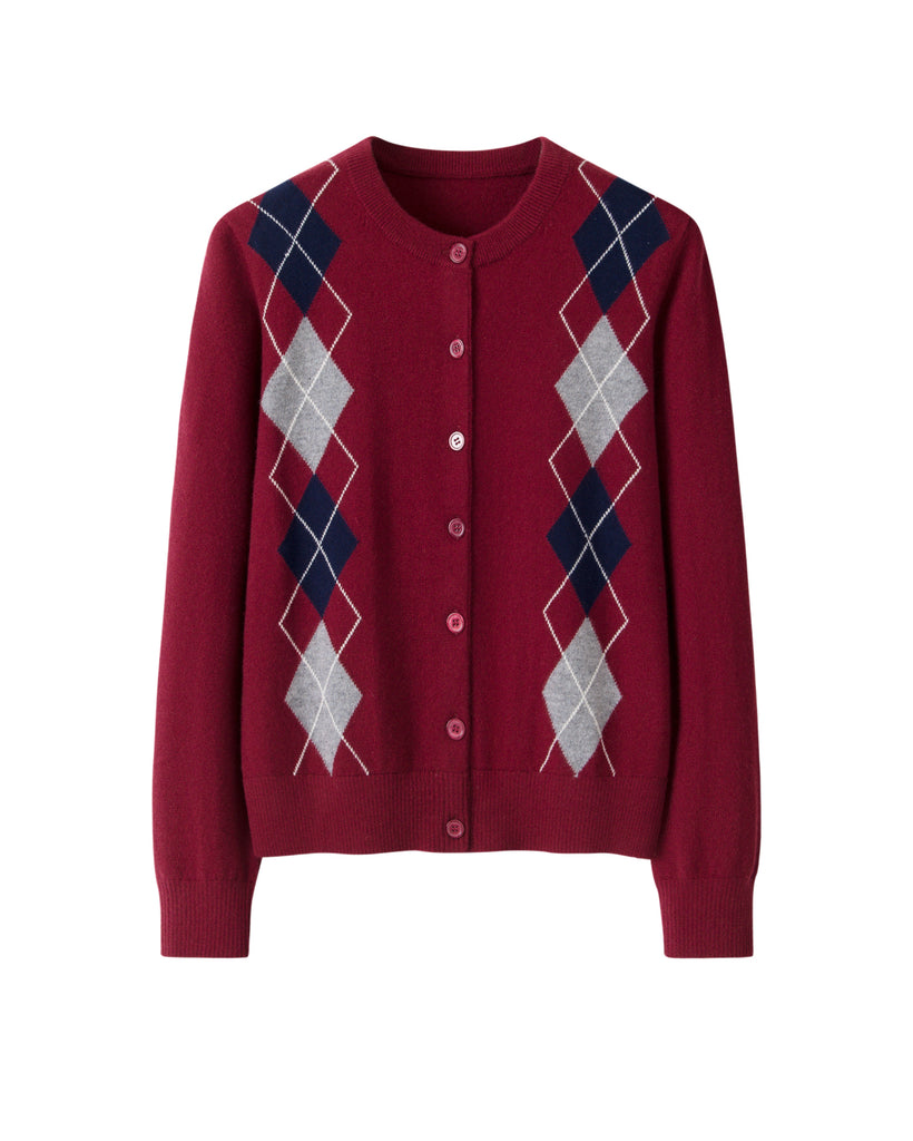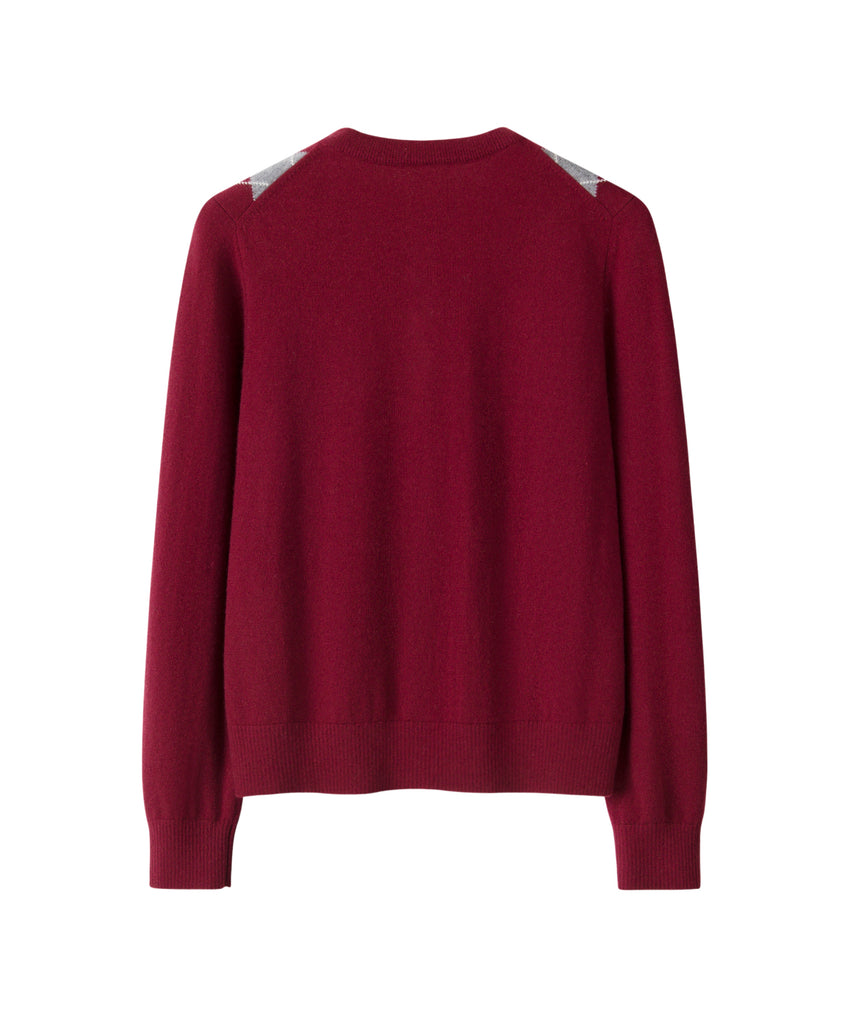 The LUCILLE cardigan is crafted from 100% cashmere, offering exceptional softness and warmth. Its timeless diamond pattern and rich red color bring elegance to your autumn and winter wardrobe. Designed with a classic button-up style and a comfortable fit, this luxurious piece complements any look with understated sophistication.