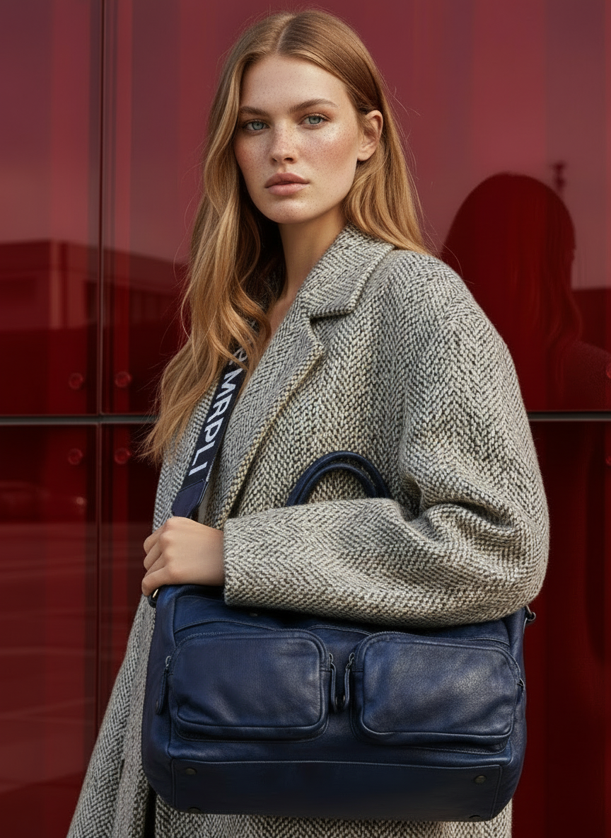 Indulge in luxury with our MT Washed Leather Bag in Denim Blue, handcrafted in Italy. Featuring an interior zip pocket, our signature Marco Tripoli logo, and a removable genuine leather strap, this bag is both elegant and functional. With two front pockets adorned with zippers and a mobile phone pocket, this bag has everything you need. This bag is the perfect addition to any sophisticated ensemble.