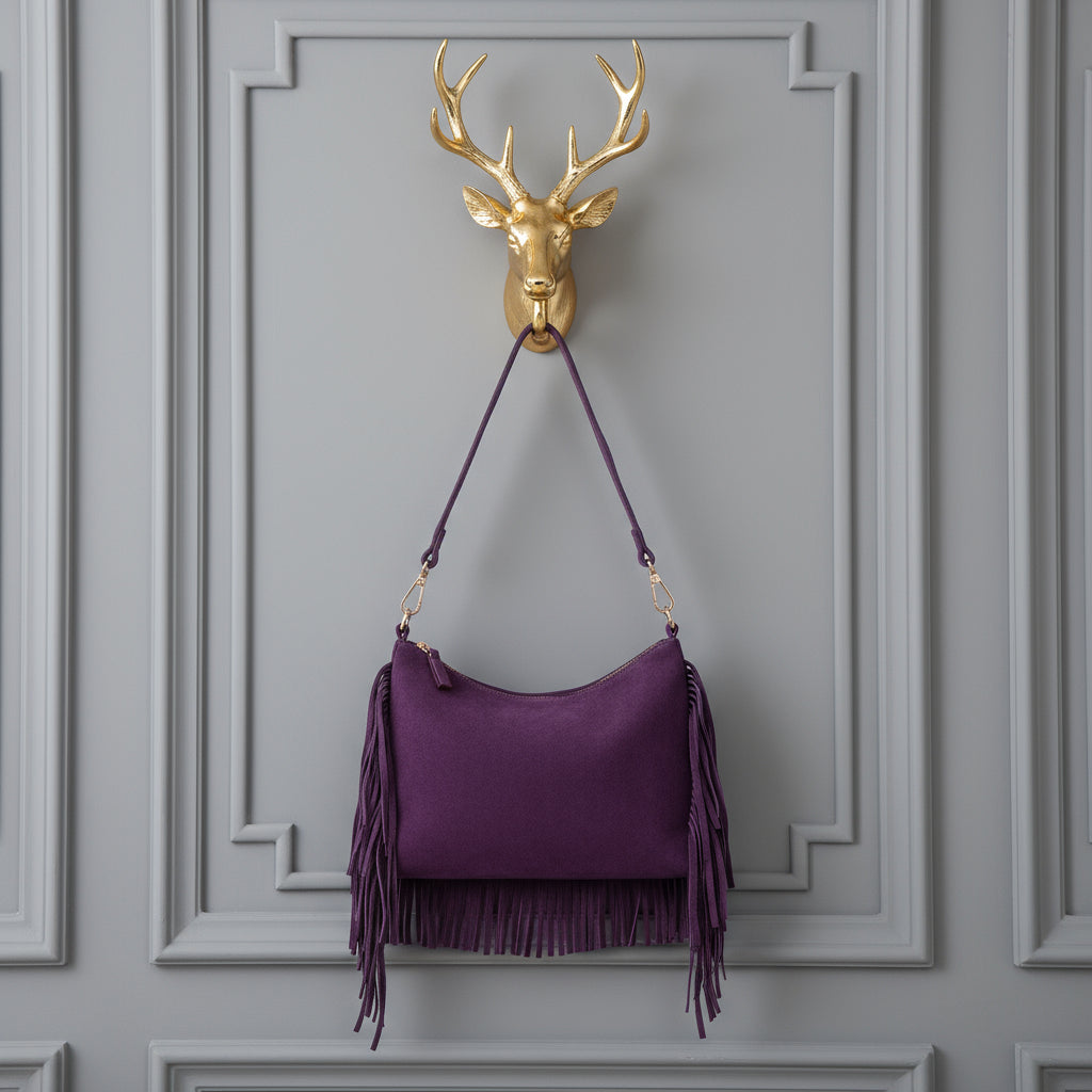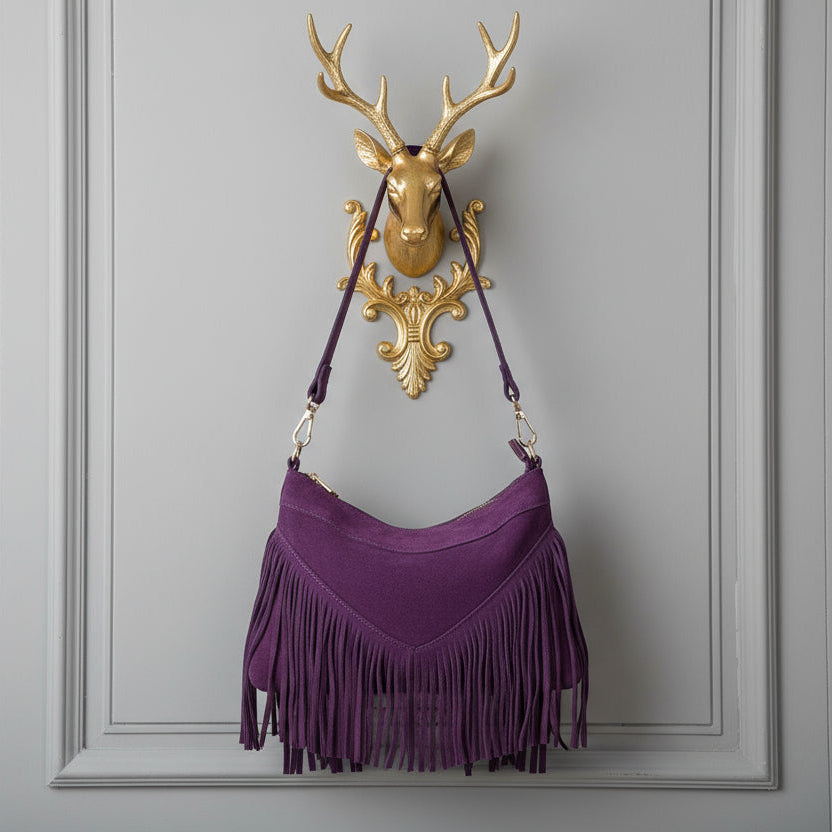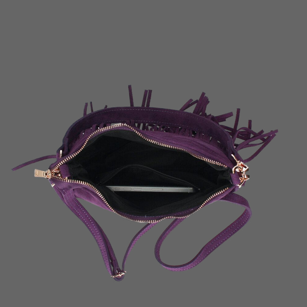 SIMONA , SUEDE CROSSBODY BAG WITH FRINGE , PURPLE