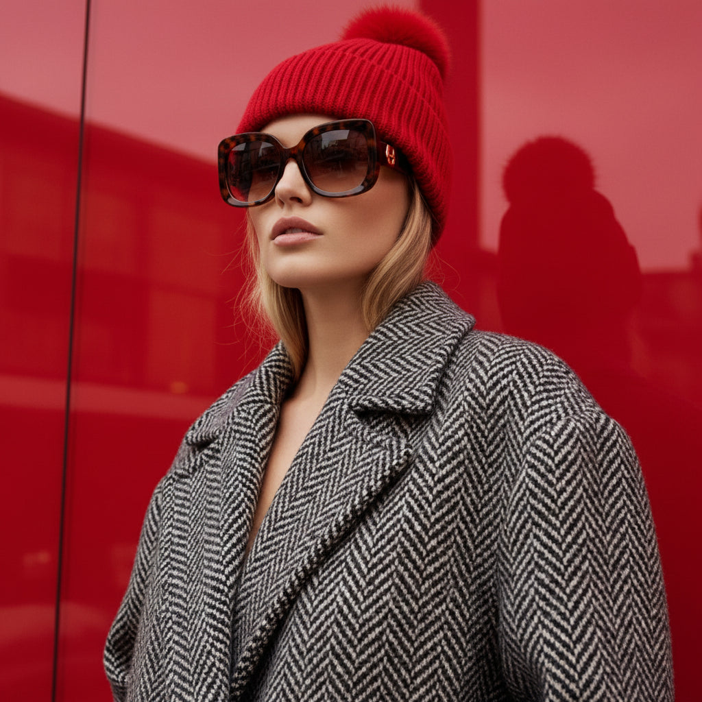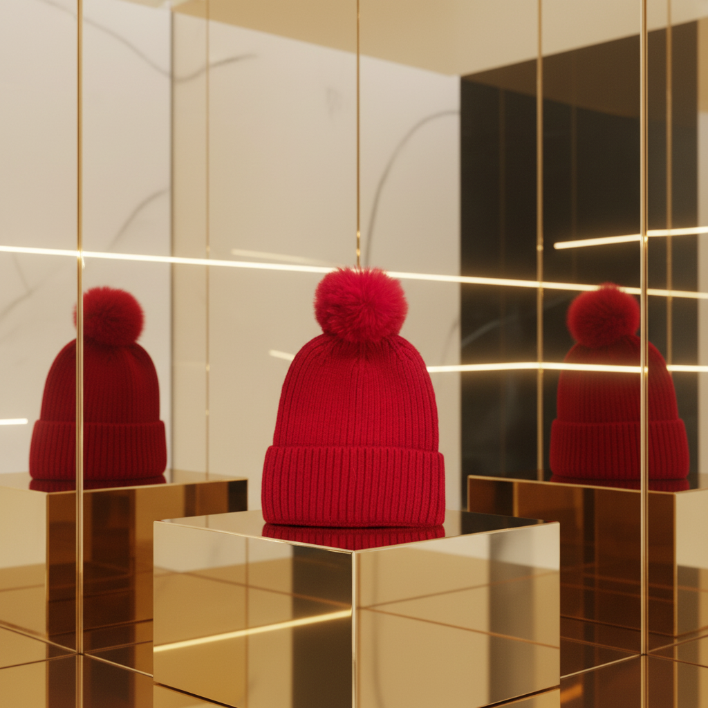 POM POM BEANIE IN CASHMERE & ANGORA , RED