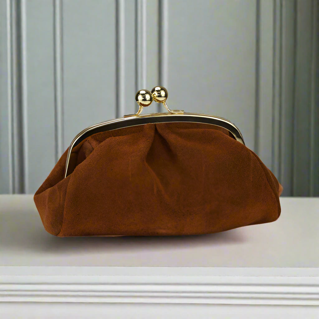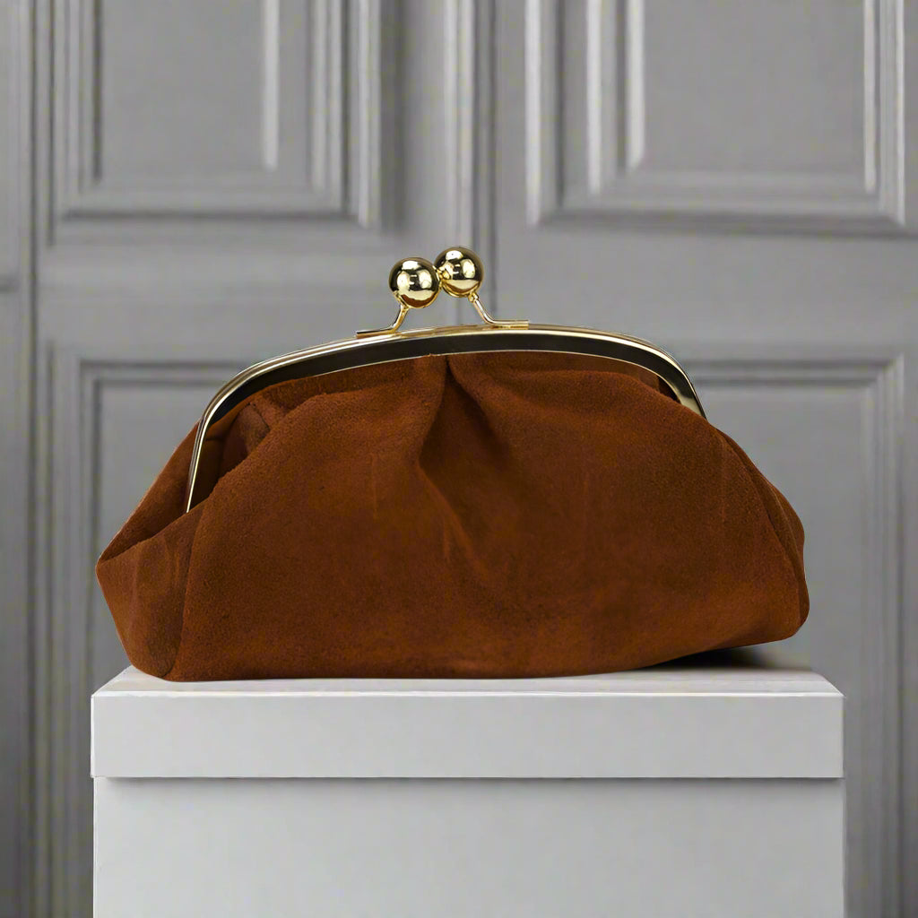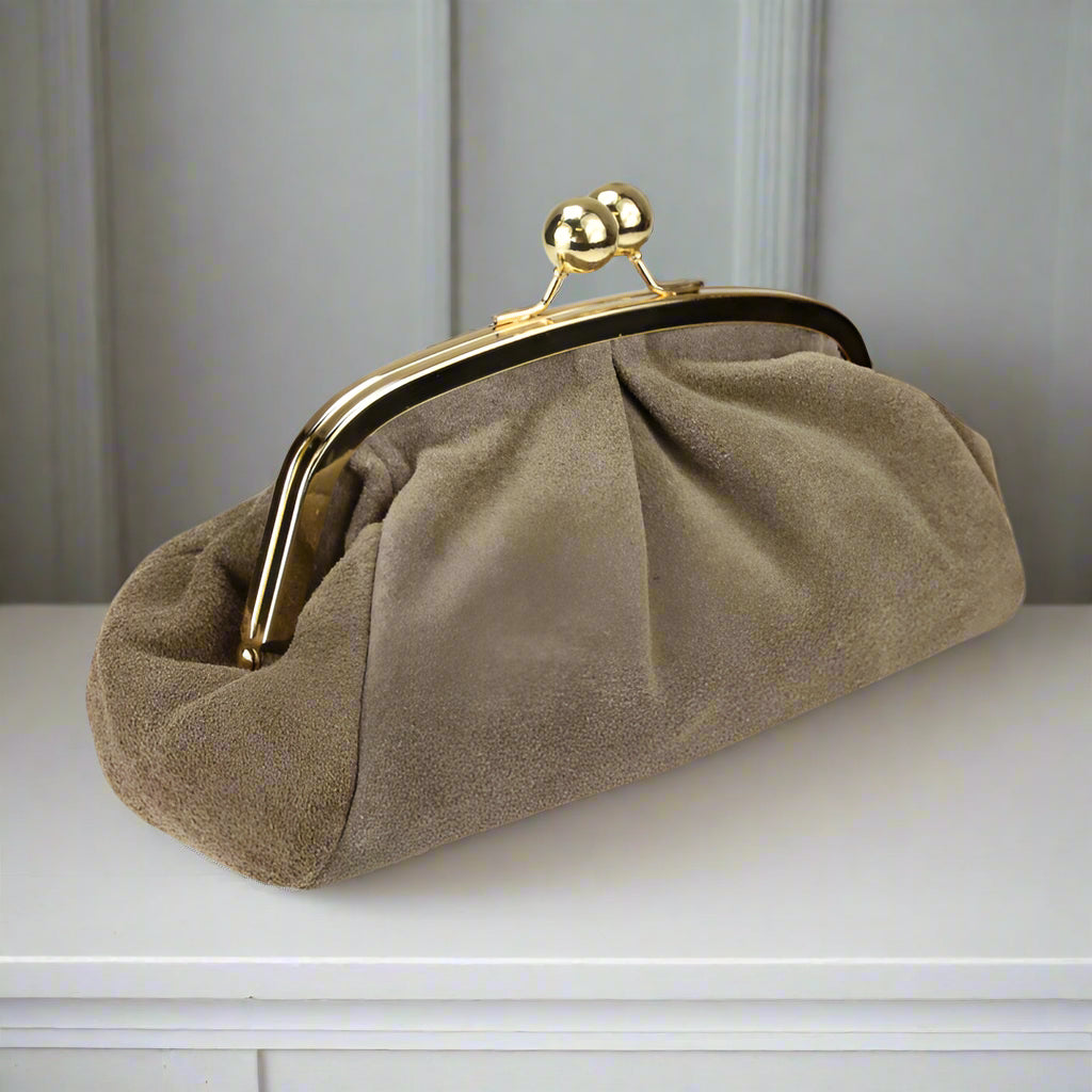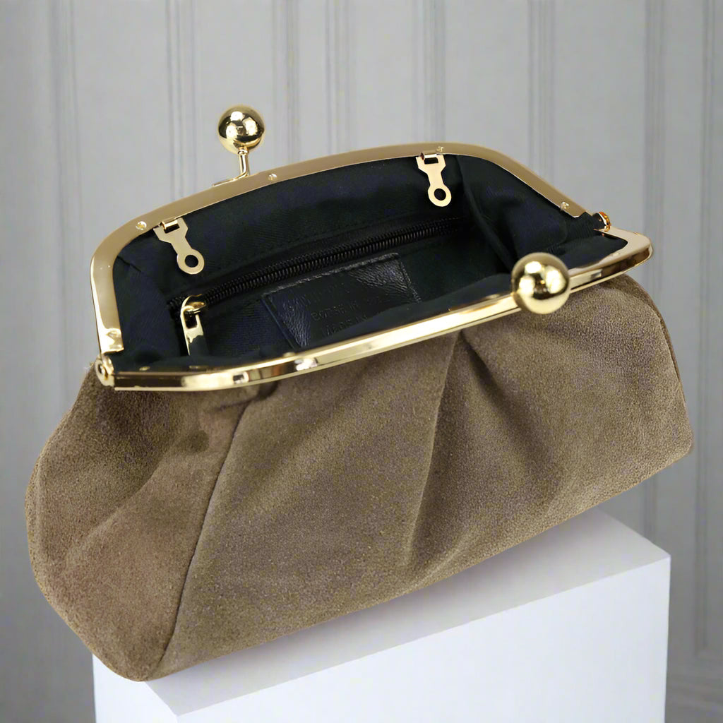 Crafted in Italy from supple suede, this clutch features a sturdy gold kiss and snap lock closure. Measuring 25cm wide by 13cm high and 10cm deep, its softly padded design offers a luxurious, flexible feel. Suitable for hand carrying or wearing on the chain, it effortlessly adapts to any event with refined elegance.