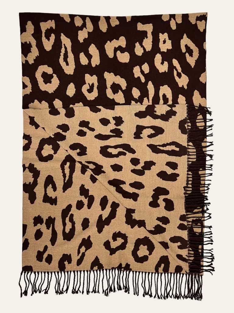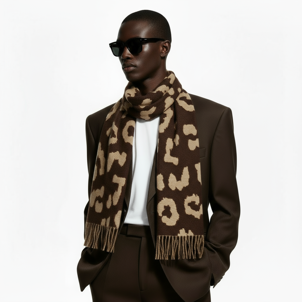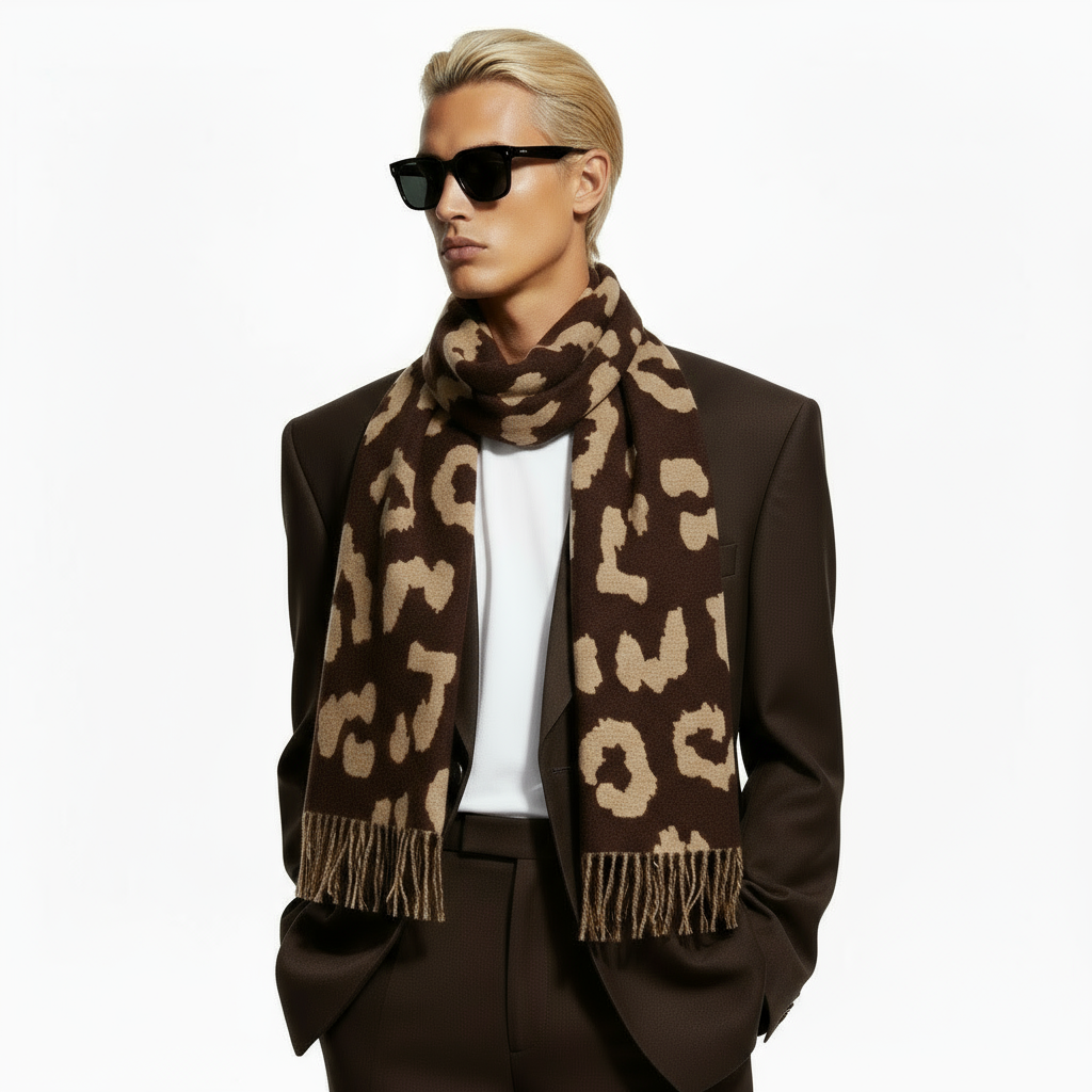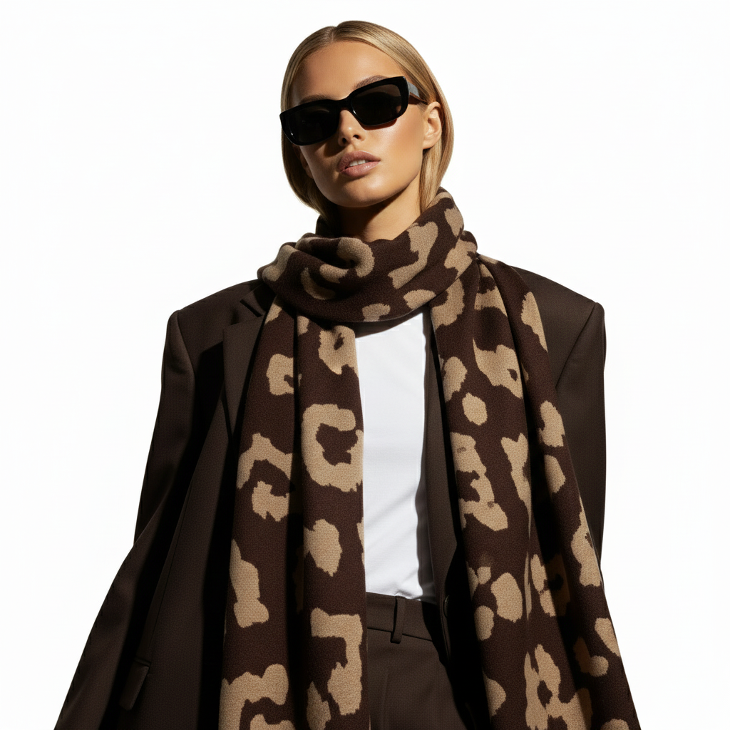 This leopard print UNISEX scarf is crafted from a luxurious cashmere blend fabric. Composed of 30% cashmere and 70% acrylic, it measures 180cm by 65cm (71 inches by 27 inches) and weighs approximately 320 grams, offering both elegance and comfort.