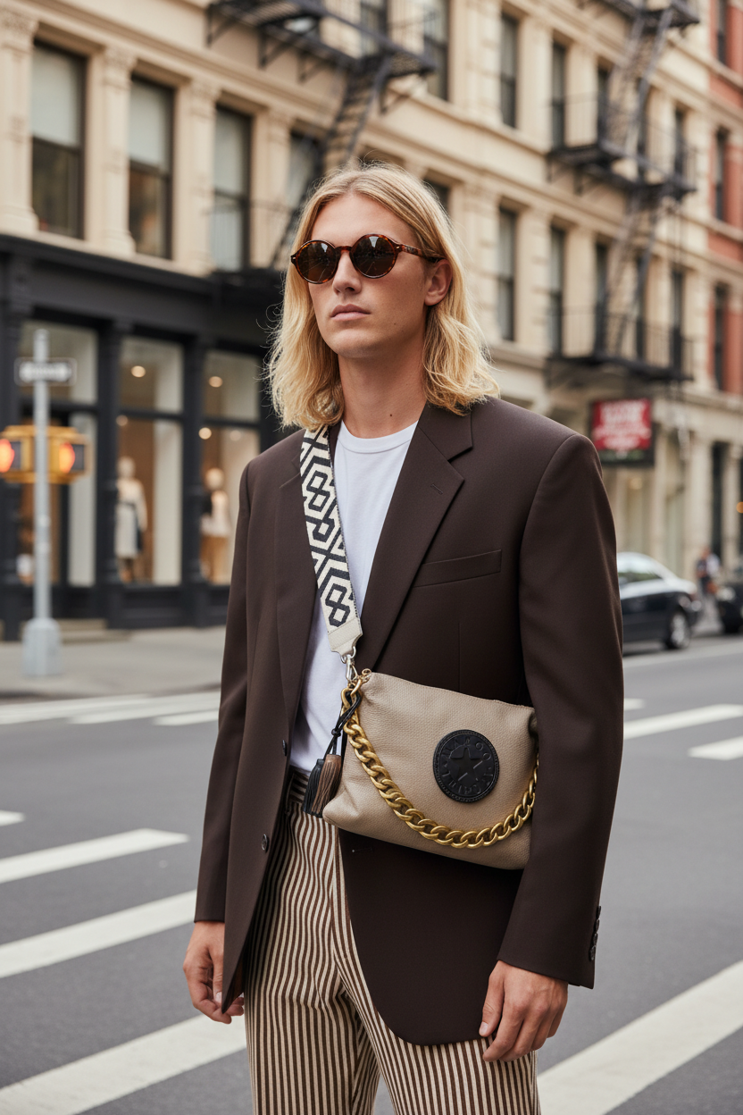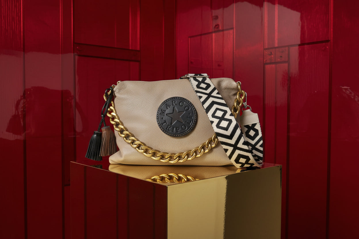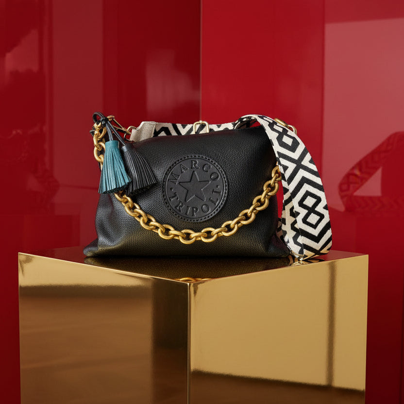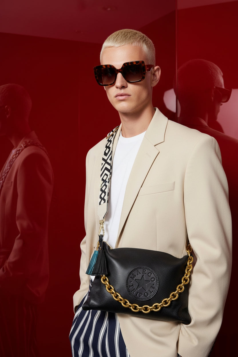 Crafted from premium leather , this Italian-made crossbody delivers understated luxury with a modern edge. The 35cm x 23cm structured silhouette comes complete with removable leather strap, ethnic shoulder strap, and chain—three ways to wear. Secure zip closure, concealed interior pocket, and eco-leather lining ensure both style and substance. Finished with tassels for refined detail.