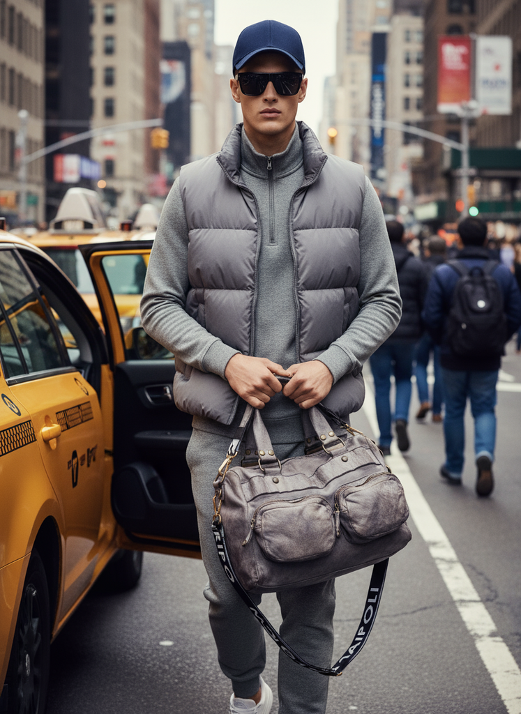 Crafted in Italy, this grey washed leather bag features a genuine leather strap that is removable for versatile wear. It includes an interior zip pocket, a dedicated mobile phone compartment, and two zippered pockets on the front for organized storage. It combines elegant design with practical functionality.