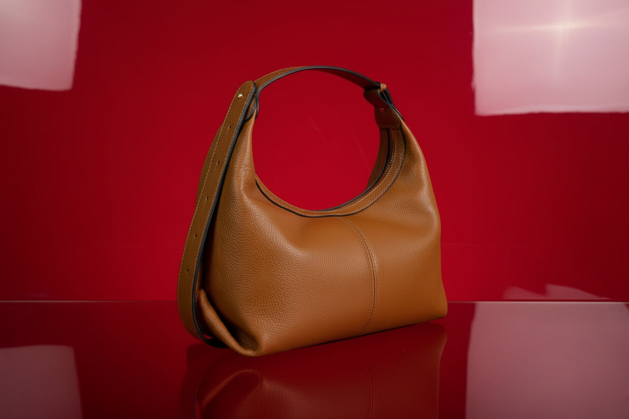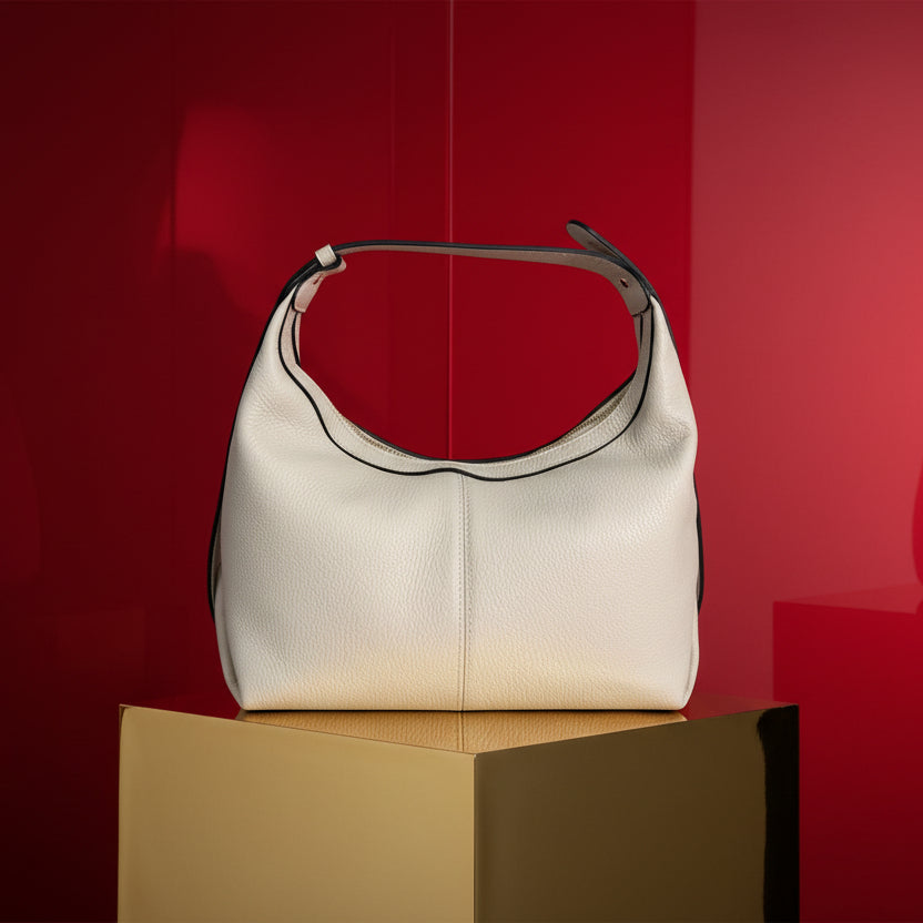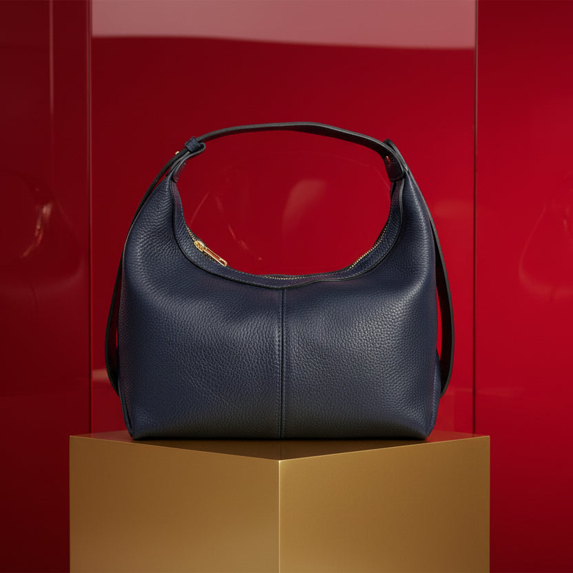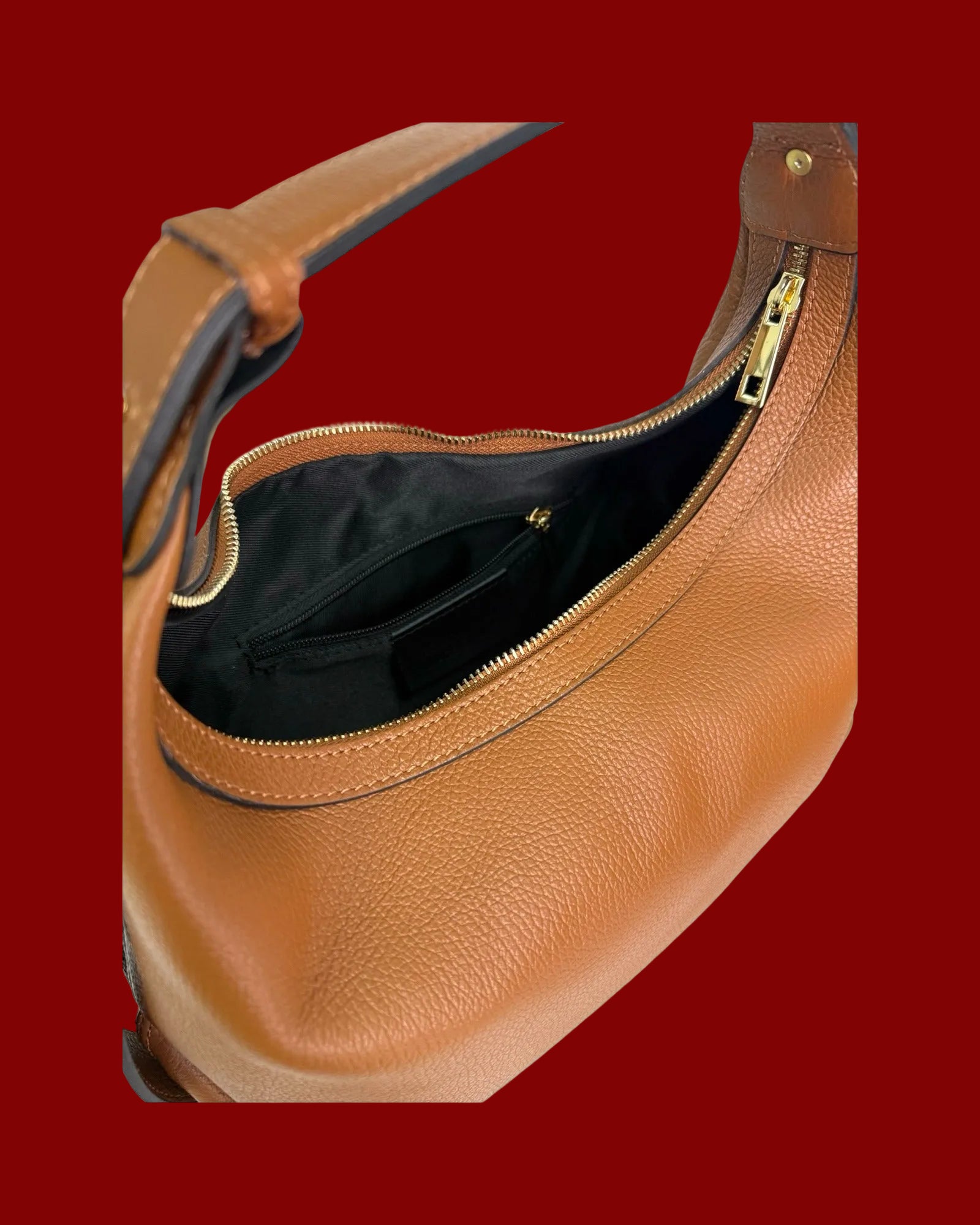 Crafted from supple pebble leather with refined gold-tone hardware, this Italian-made handbag transitions effortlessly from hand-carry to shoulder wear with its adjustable leather strap. The structured silhouette measures 33cm × 28cm × 14cm, offering practical capacity without compromise. Inside, a zip pocket keeps essentials secure, while the eco-leather lining reflects conscious craftsmanship. A rear exterior zip pocket adds convenient access. The secure zip closure and non-removable yet adjustable strap ensure versatility for modern urban styling.