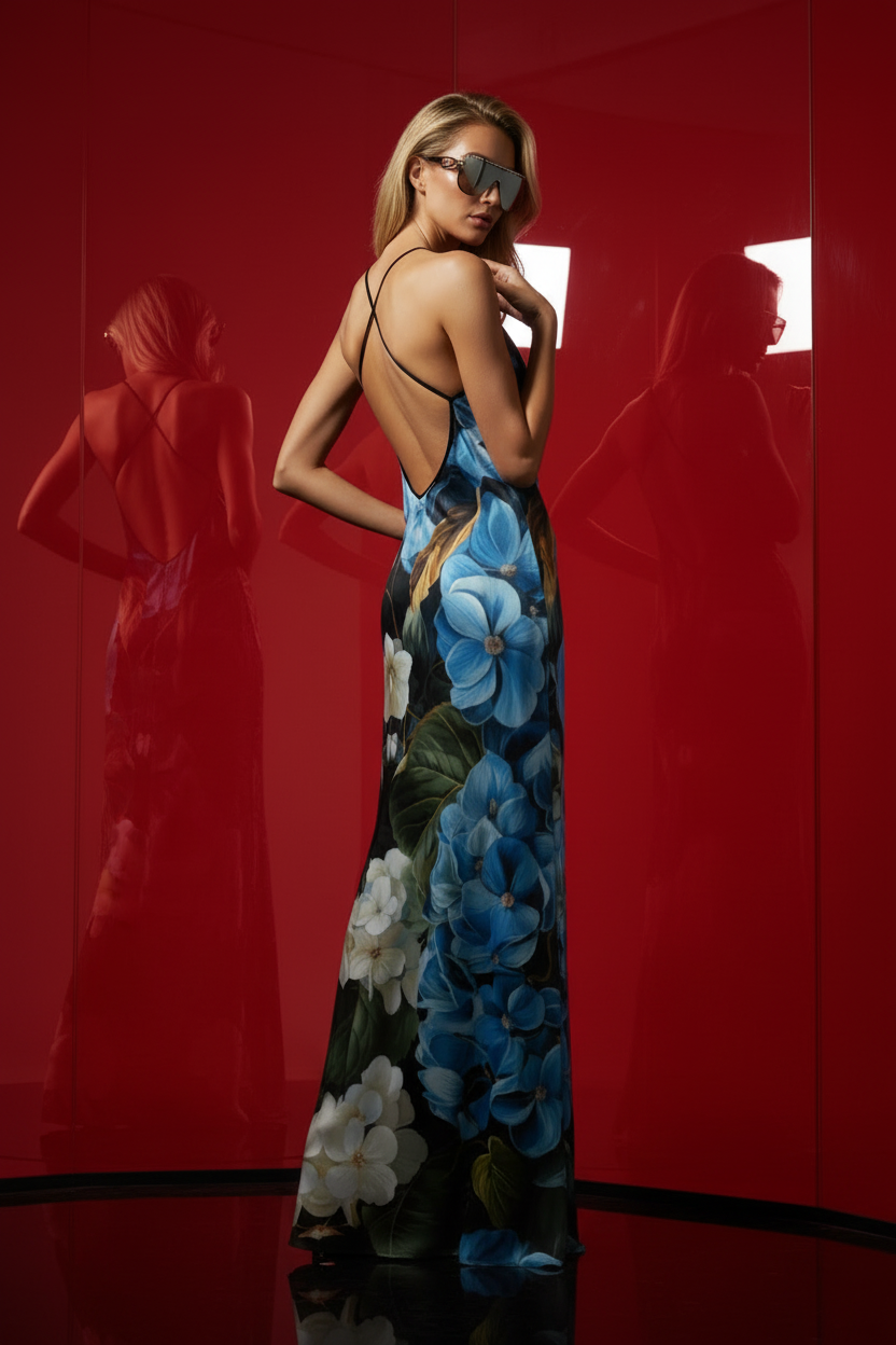 Crafted from luxurious 100% silk satin, this striking backless dress epitomizes editorial elegance. The dramatic cascade front and graceful train create an unforgettable silhouette, while the signature Marco Tripoli print adds a distinctive narrative to every wear. A statement piece for those who command attention through refined minimalism and bold design.