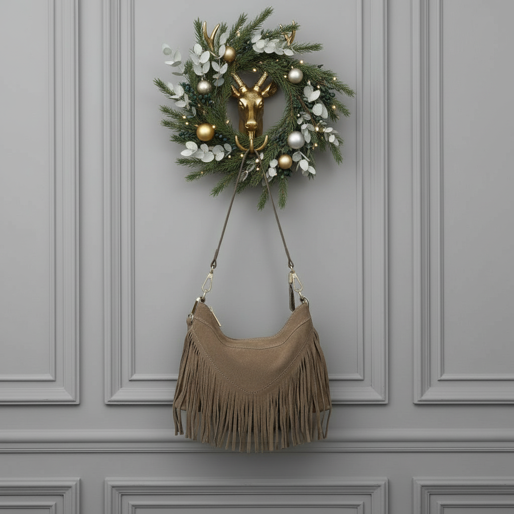 SIMONA , SUEDE CROSSBODY BAG WITH FRINGE , TAUPE