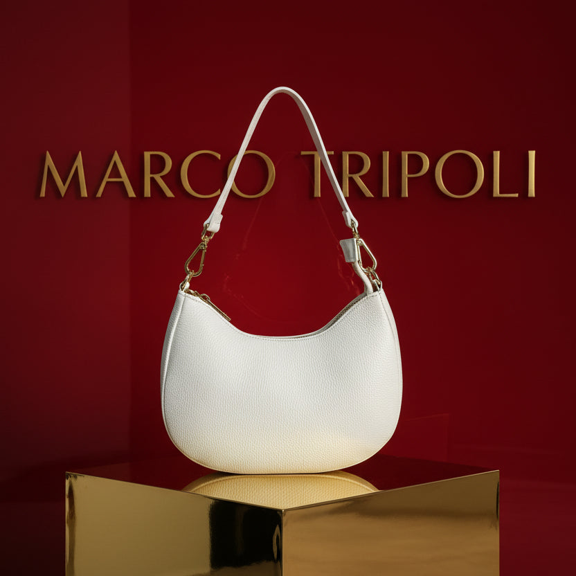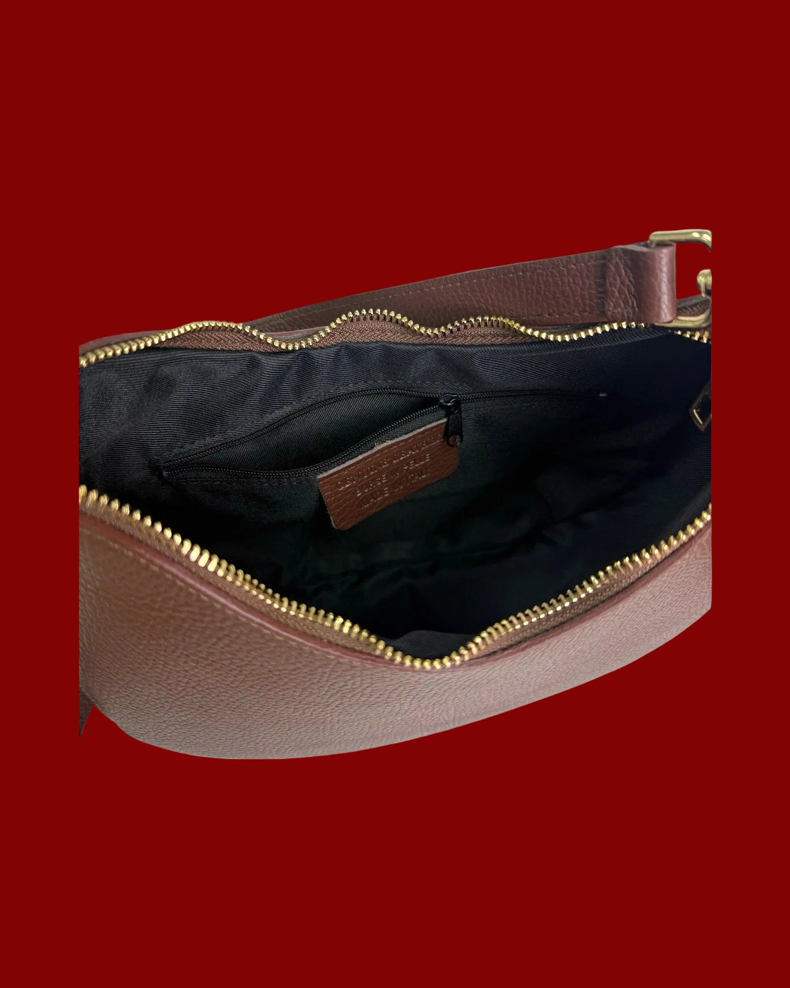 Crafted from genuine pebble leather, the Charlotte combines refined elegance with practical design. The structured silhouette features an eco-leather and fabric lining, an interior zip pocket for secure storage, and an exterior zip closure. A removable gold chain shoulder strap offers versatility between shoulder and crossbody carry. Meticulously made in Italy, this 24x20x7 cm bag delivers understated luxury for the discerning wardrobe.