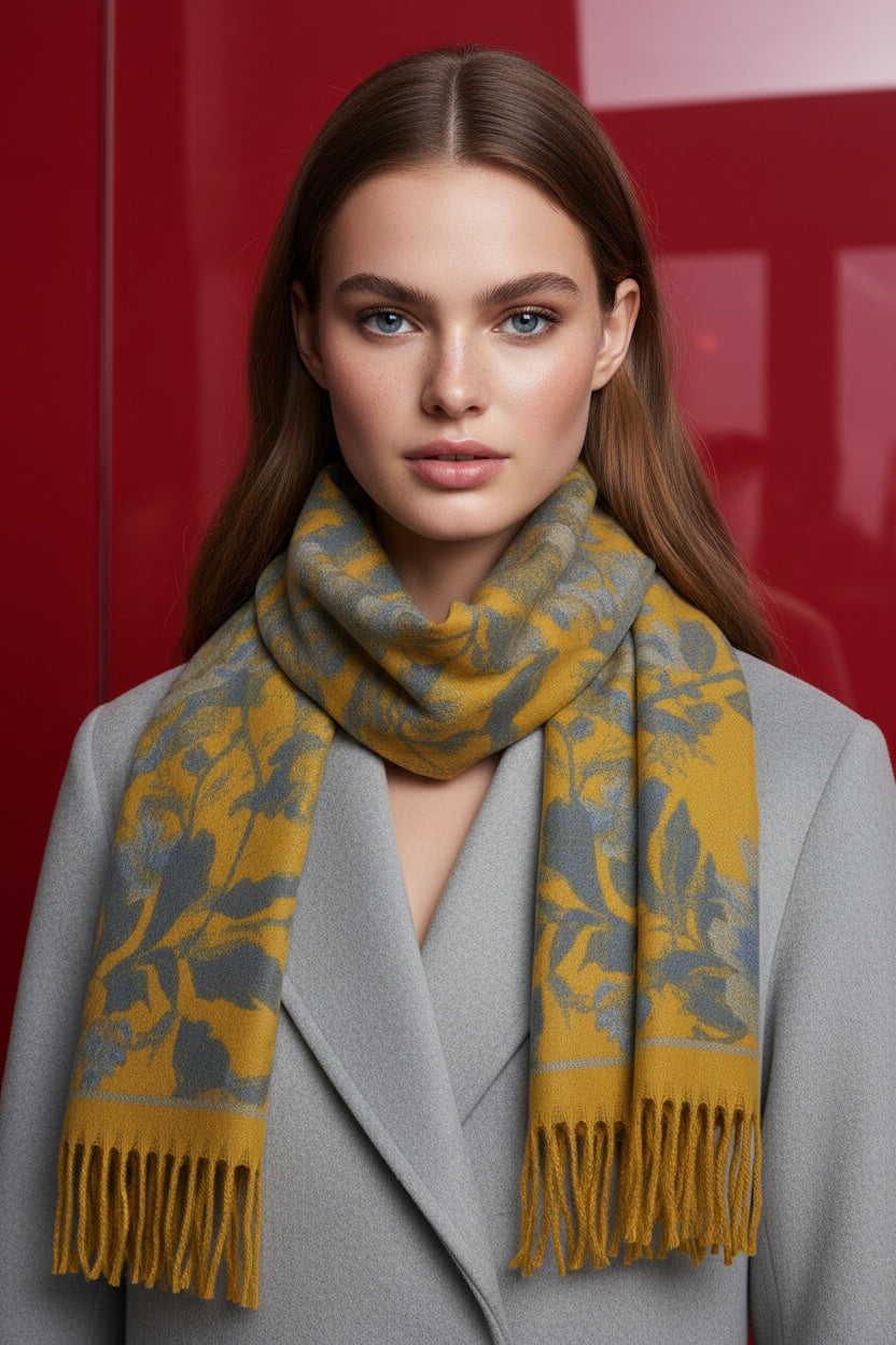 The Florence scarf combines timeless elegance with everyday luxury. Crafted from a premium cashmere blend (20% cashmere, 80% viscose), this generously proportioned wrap delivers a sumptuous, butter-soft feel that drapes with effortless sophistication. The reversible floral design offers versatility, allowing you to transition between two distinct aesthetics with a single piece. At 180cm × 67cm and weighing 310g, it provides substantial warmth and coverage for cooler seasons. Available in six refined colorways—cream, pink, fuchsia, mustard, blue, and black—the Florence adapts seamlessly to your wardrobe. A refined accessory that balances comfort with understated luxury.