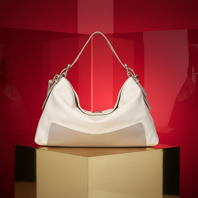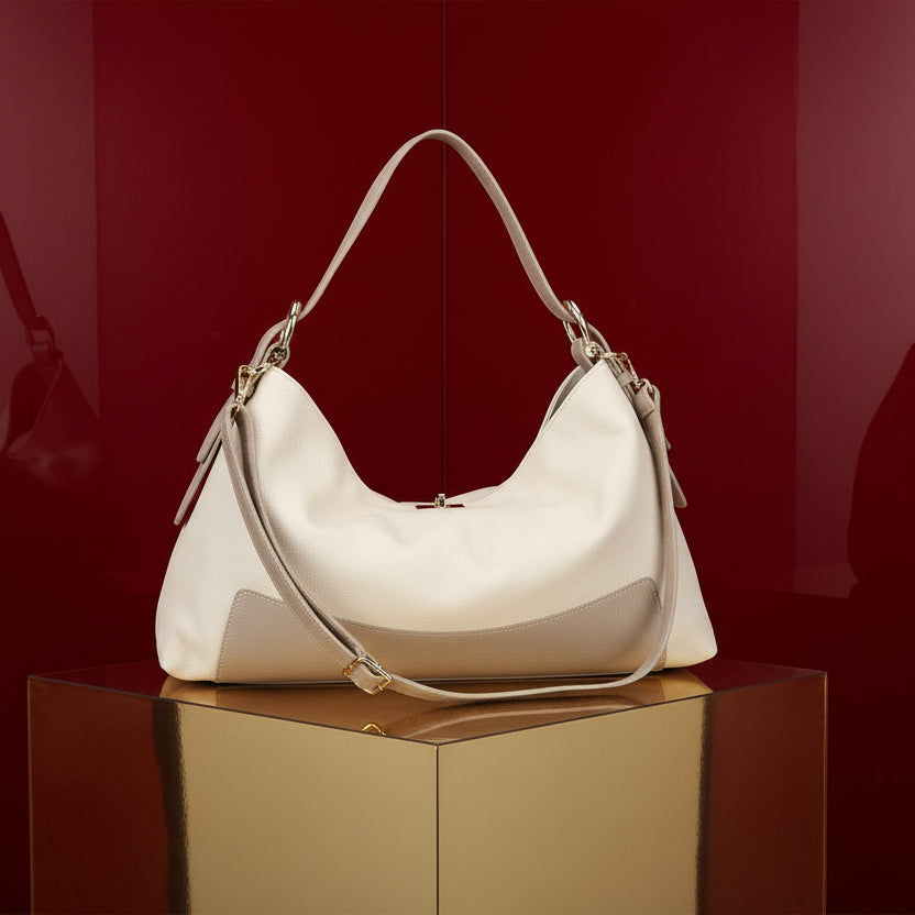 The Monroe is an oversized unisex shoulder bag crafted from supple pebble leather in a refined off-white and stone palette. Designed for modern versatility, it features a secure zip closure, internal organisation with a dedicated phone compartment and zip pocket, and an adjustable strap for effortless styling. Lined in durable polyester and made in Italy, this substantial piece measures 46cm x 27cm x 9cm and weighs 1.1kg—the perfect companion for daily essentials and beyond.