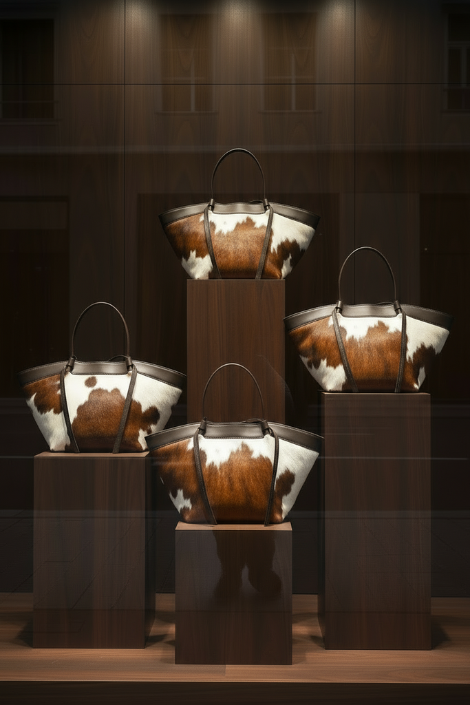 This multi-toned tote bag combines cowhide and pebble leather, perfect for urban living with a chic appeal. It features an interior lined with zippered compartments and elegant gold metal hardware. Measuring 37cm in width at the base, 24cm in height, and 13.5cm in depth, it offers both style and practicality for the modern city dweller.