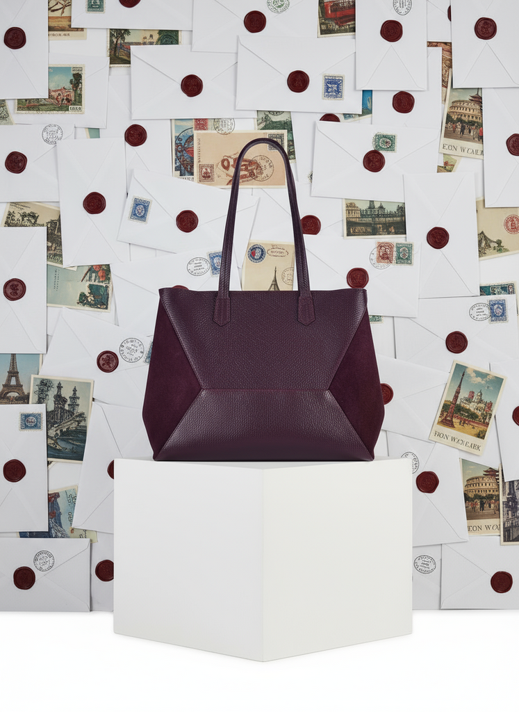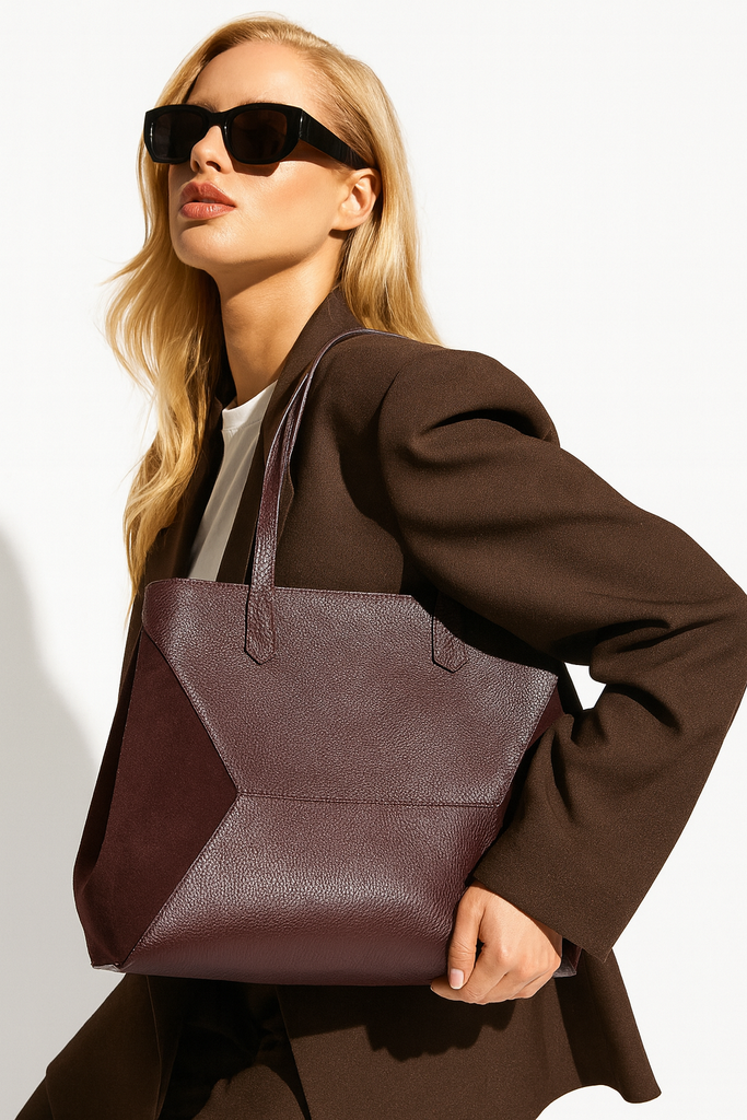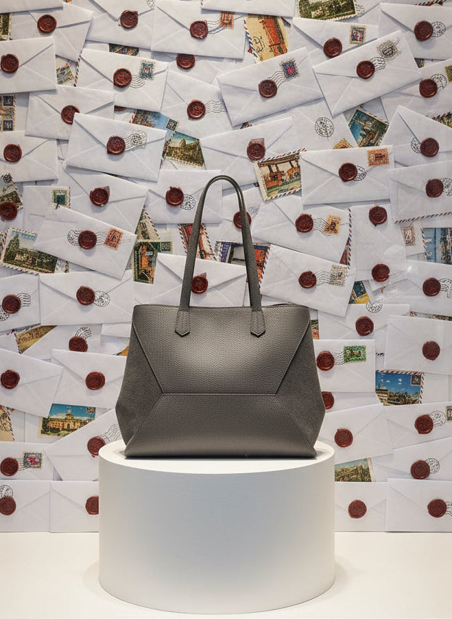 Crafted from suede and pebble leather, this large envelope tote bag features a zip closure and side clip. Inside, it includes a fabric pouch with zip measuring 29 x 20 x 10 cm. Accented with gold hardware, its dimensions are 33 x 27 x 21 cm. A unisex design, it is a best seller known for its fashionable appeal. Made in Italy by skilled Italian artisans, it exemplifies refined craftsmanship and timeless style.