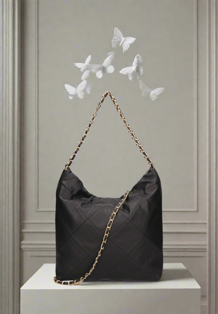 AURELIE , QUILTED LEATHER SHOULDER BAG , BLACK