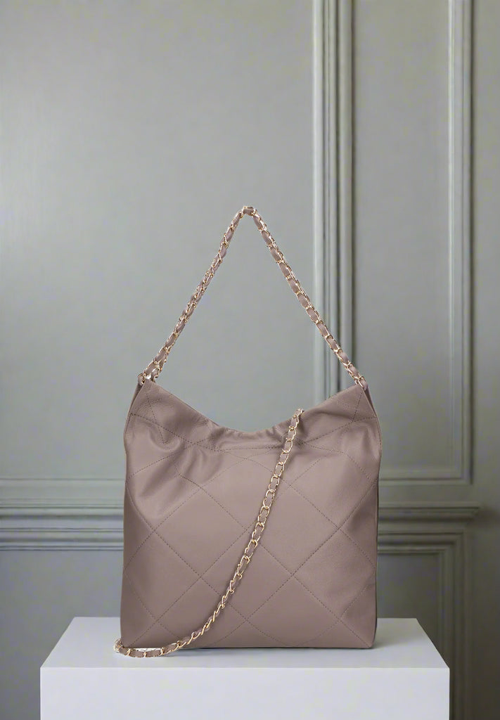 AURELIE , QUILTED LEATHER SHOULDER BAG , TAUPE