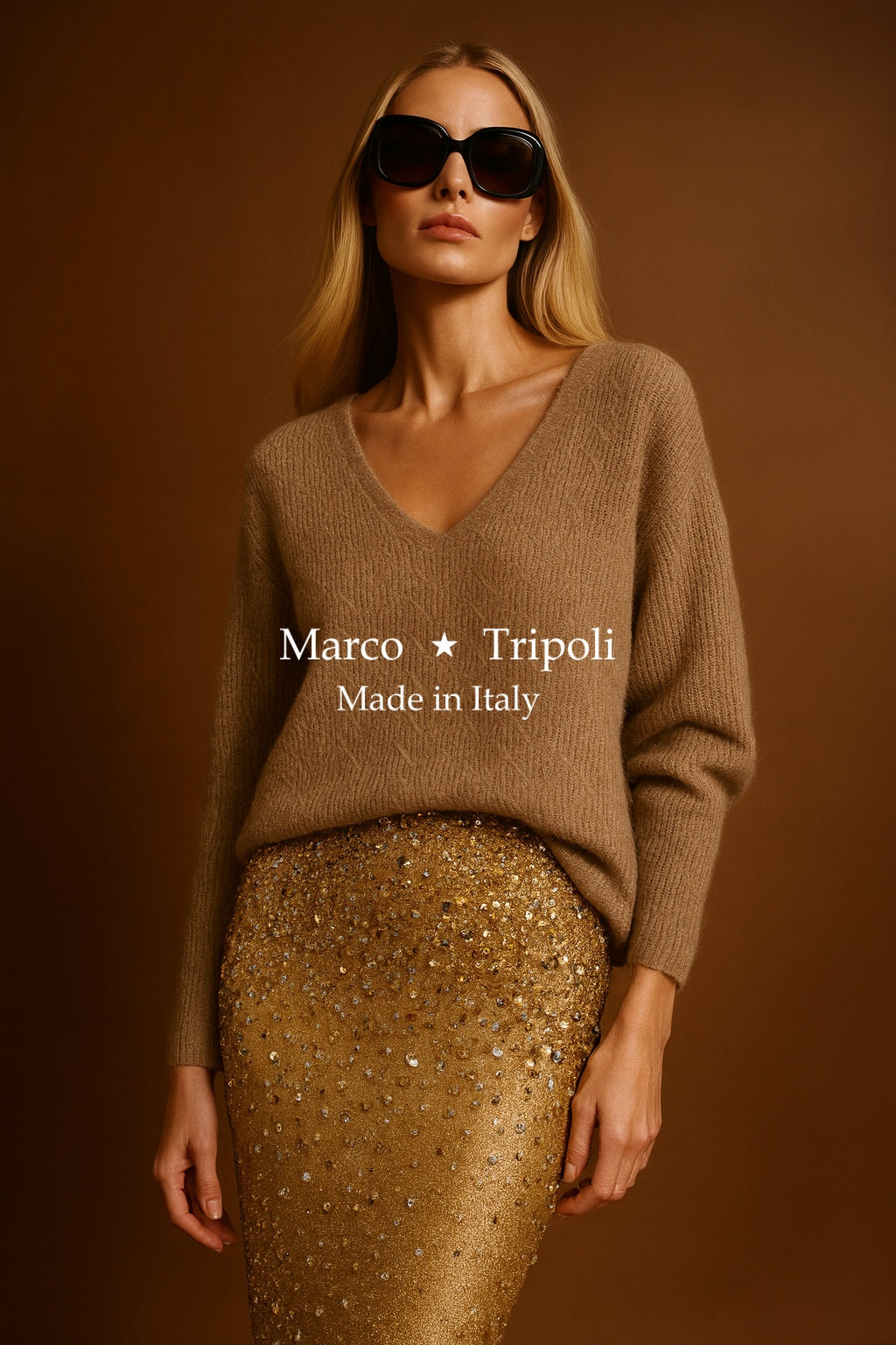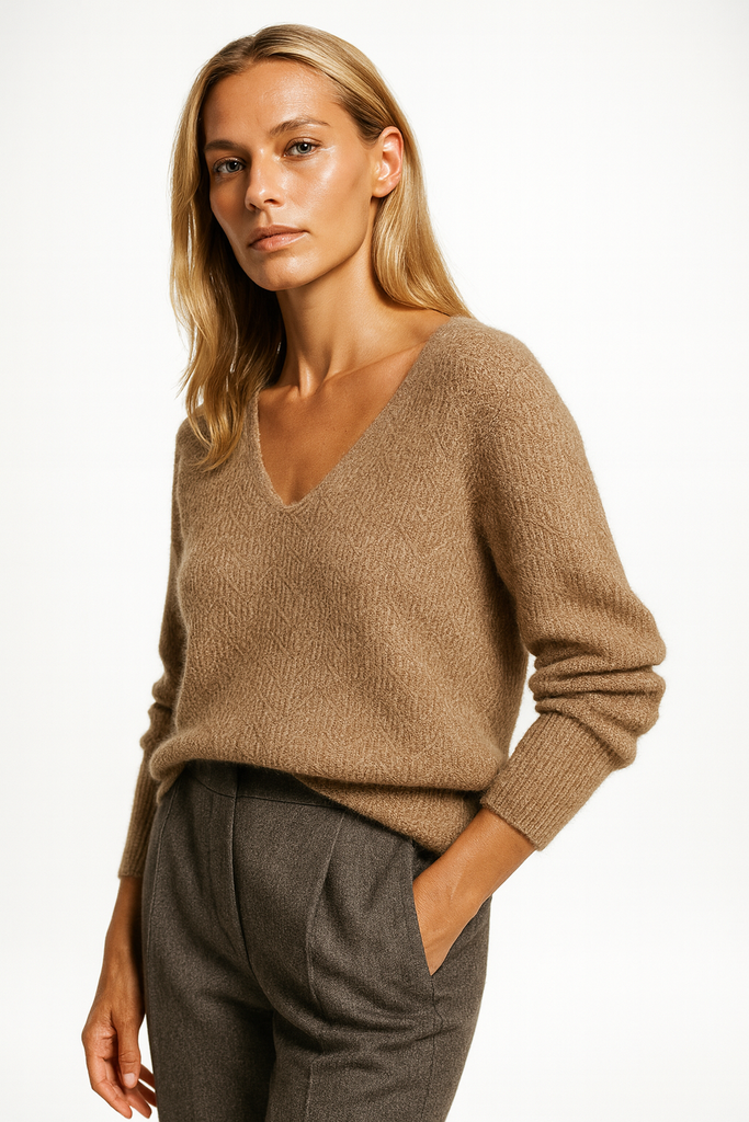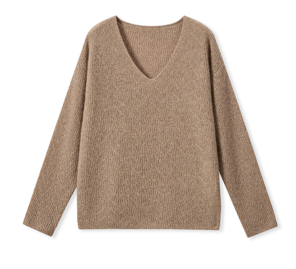 This 100% cashmere V-neck sweater offers a refined and comfortable fit, perfect for autumn and winter. Its timeless design and soft texture come in elegant colors like pink, white, and camel. Crafted from natural fibers, it combines style and sustainability effortlessly for a versatile wardrobe essential.
