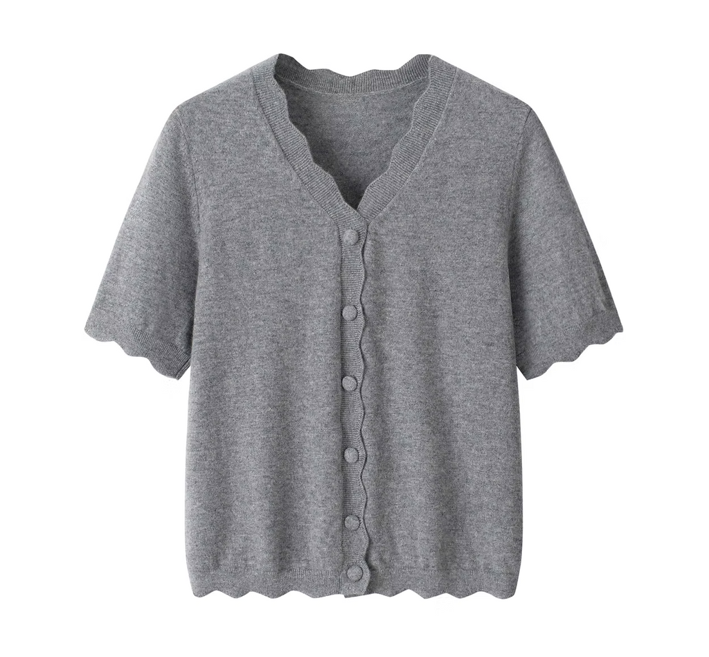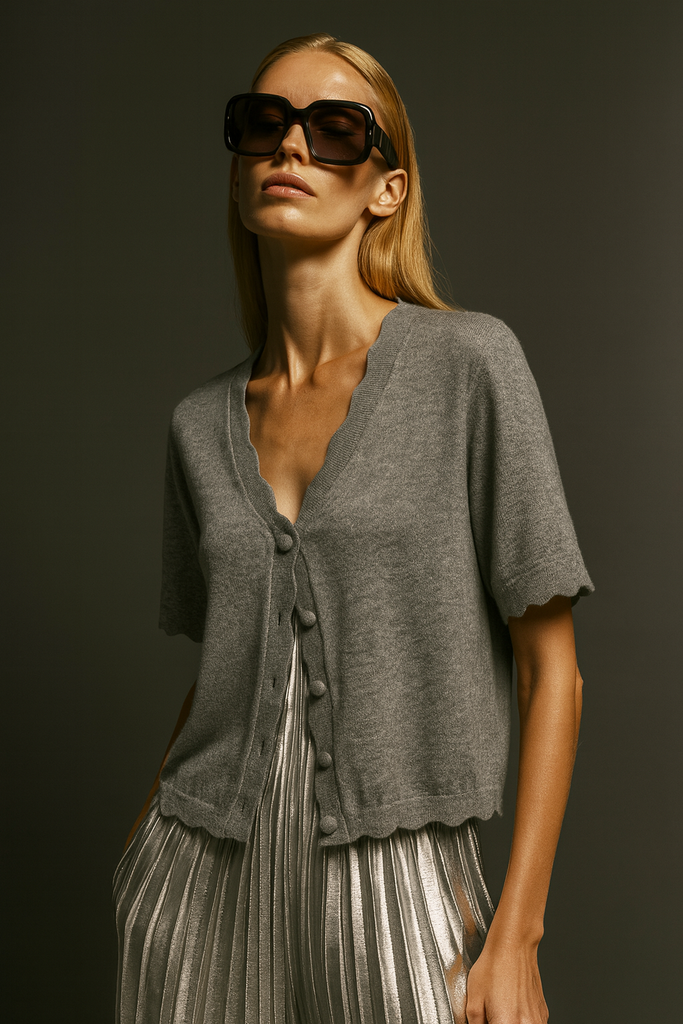 Our Short Sleeves sweater blends timeless style with luxurious comfort. Crafted from 100% cashmere, it features a flattering V-neck and delicate ruffle details on the sleeves. Lightweight yet warm, its regular fit and elegant grey hue make it an essential piece for colder seasons. Available in sizes M to XXL.